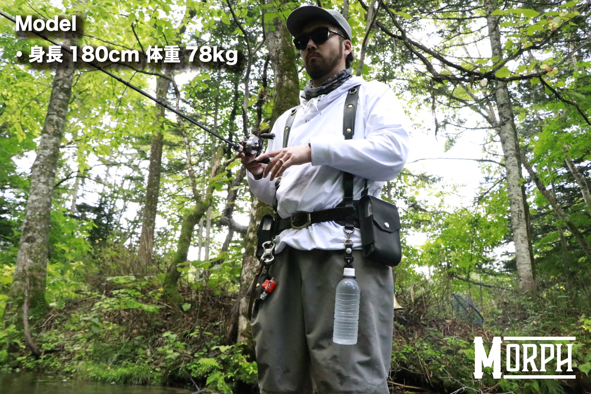 当商品は、別売りのウェーディングベルトと装着していただく事で、操作性を向上させる事だけではなく、腰回りに集約した携行品の荷重負荷を肩と腰に分配させる事により、身体にかかる負荷を限りなく抑え、疲労を軽減させる事を設計背景としている商品です。