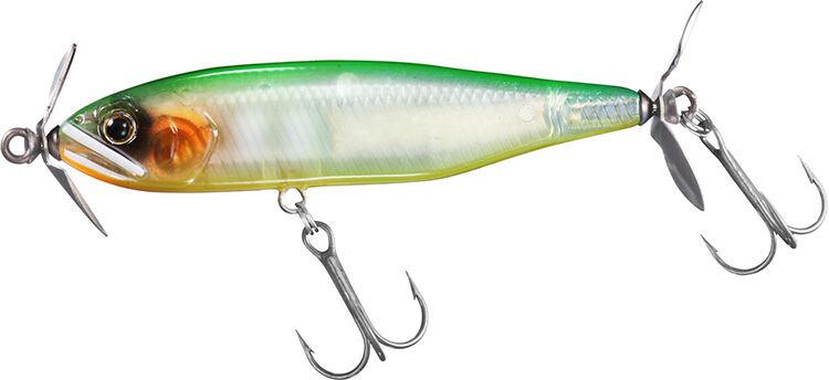 その名の通りトップウォーターとして使えるフローティングモデル。早めのリトリーブを行えば軽快に飛沫を上げ、スローに引けばベイトフィッシュライクな弱い引き波を発生させながら直進する。ミスバイトが多発する水面系の釣りだが、直線上を進むプロップベイトは魚から狙いが定めやすくフッキングが決まりやすい傾向がある。
