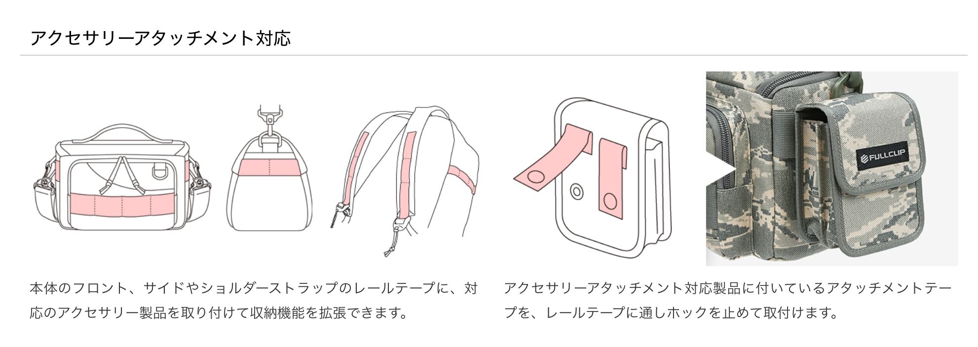 本体部・仕切り口元はテープ・生地の折り返しが無い設計となっています。マチ蛇腹部には、開閉時の屈曲とフックによる裂けを防ぐためにリップストップナイロンを採用しています。装着は縦、横どちらからでもアジャスト出来る2WAY仕様です。