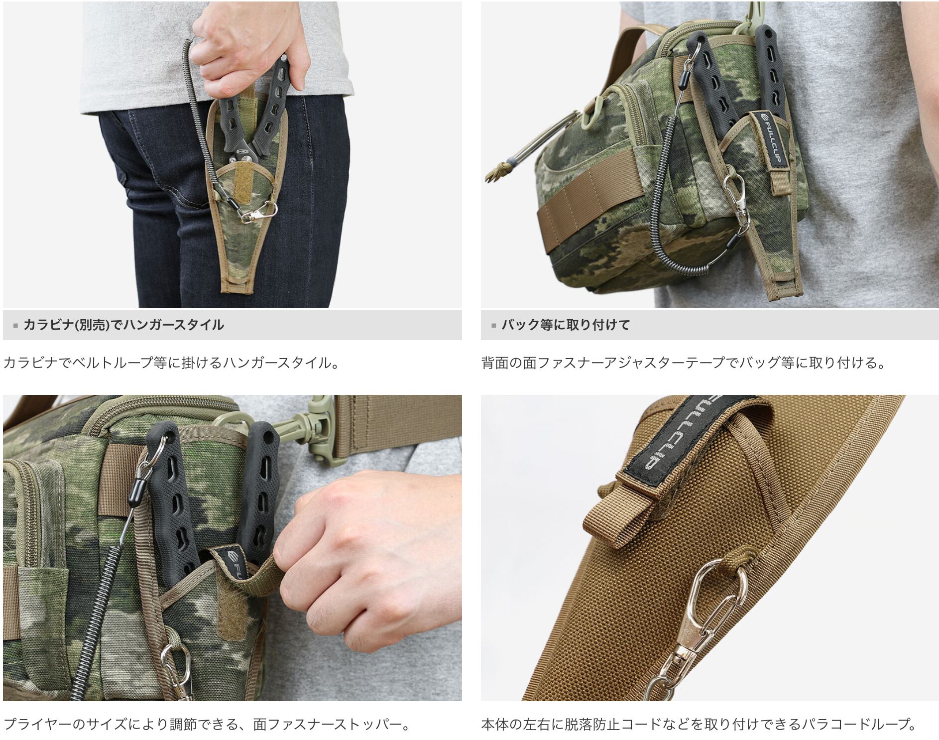 SPACESHIP (スペースシップ)は、止める位置を調節できる面ファスナー式ストッパーにより、様々なサイズのプライヤーに対応できるプライヤーケースです。本体には厚い芯材を使いハリと硬さがありますので、プライヤーの出し入れがスムーズに行えます。脱落防止コードなどを取り付けできるパラコードループは、本体の左右両方にあるので、ケースを右左どちらに取り付けても、コードが邪魔にならないセッティングが可能です。