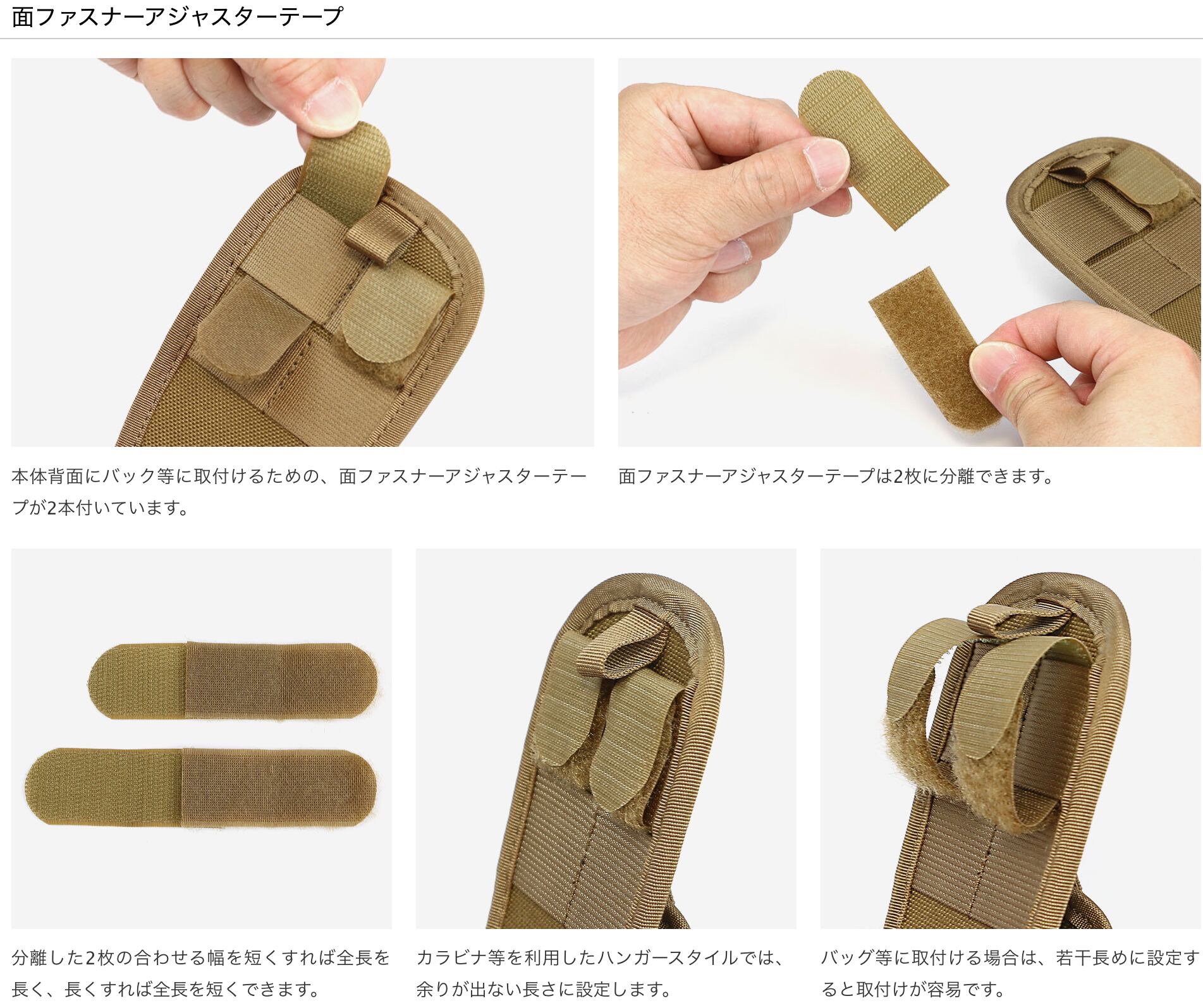 背面の面ファスナーアジャスターテープを利用してバッグなどに取付けたり、テープループにカラビナなどを取付けてぶら下げるハンガースタイルでも使えます。面ファスナーアジャスターテープを取付けるレールテープは上下2レールあり、取付け位置を変えることで高さの変更ができます。また、面ファスナーアジャスターテープ自体の長さも変更できますので、緩めで付けたりキツめで付けたりの調節もできます。
