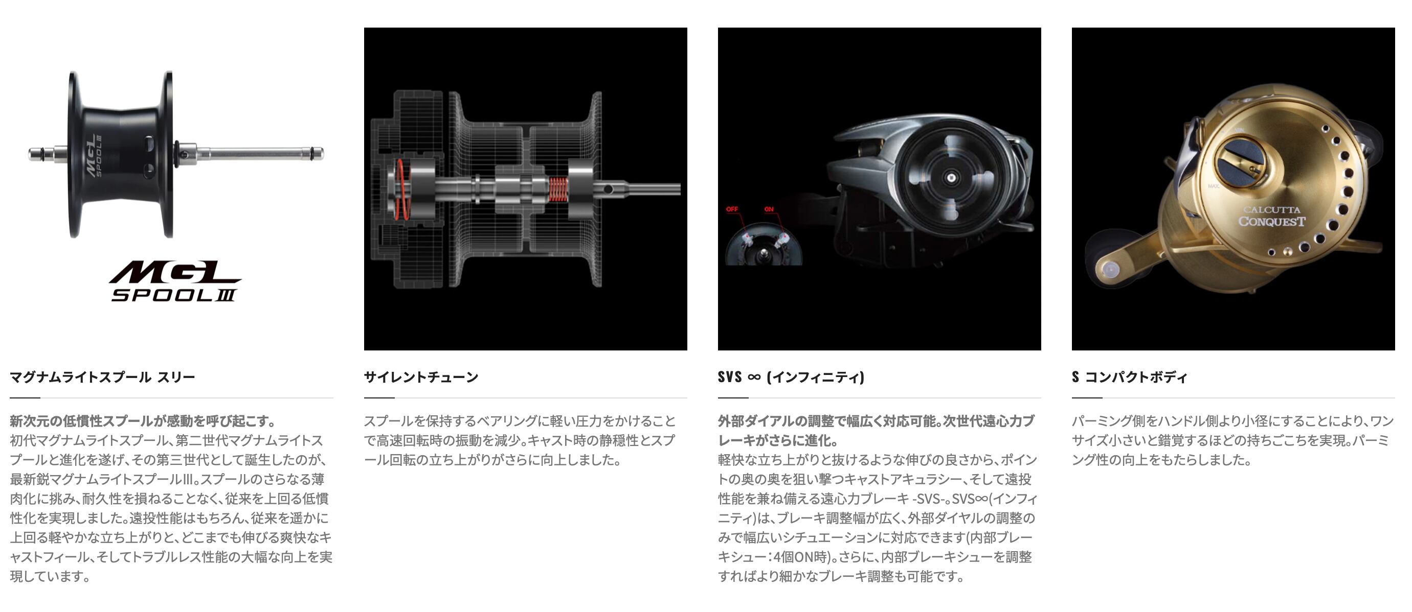 金属ボディがもたらす、剛性感溢れる巻きごこち。カルカッタコンクエストは、ソルト用ベイトリールで評価の高いインフィニティドライブをバスリールとして初めて搭載。回転抵抗が大幅に軽減され、巻き上げの感度、パワー、フィーリングともに大きく向上しました。ボディをロープロ化することによりパーミング性がアップ。低慣性の、マグナムライトスプールⅢを新たに採用し、ストラクチャーの奥へ低い弾道でルアーを送り込むことが可能です。ギア比7.5、最大巻き上げ長89cmのXGがラインナップに加わり、パワフルかつハイスピードな巻き上げを可能にしています。