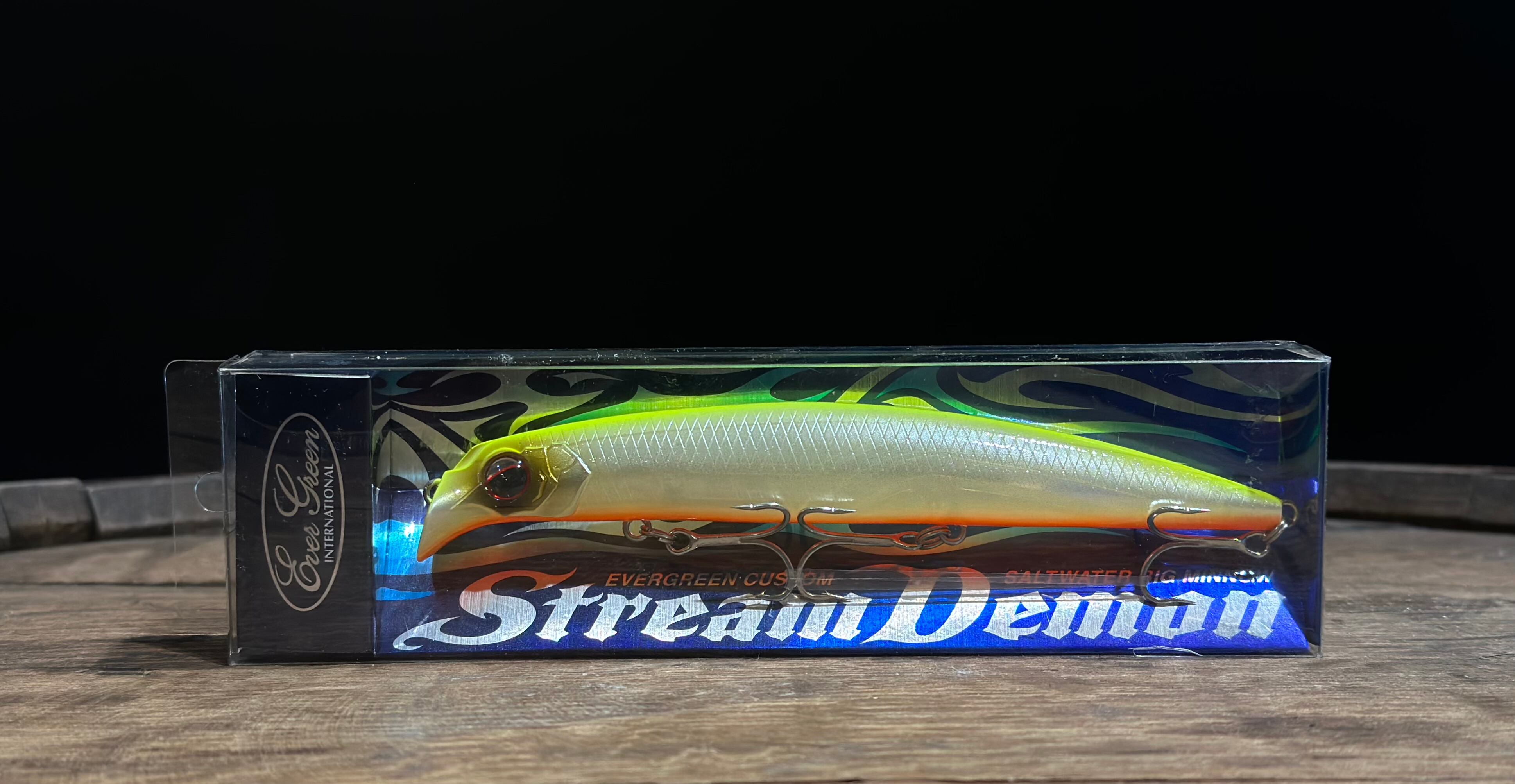 独特な風貌のヘッド形状は下部がワイドで上部が水流を適度に逃がすデザインで、モンスター好みの水をまとった柔らかいウォブルロールアクションを生み出します。また、河川でのモンスター狩りに照準を合わし、アップクロスからのドリフトで流れに押された状態でも、潜りすぎず浮き上がらず、ランカー好みのレンジをトレース出来ます。全長16cmの迫力あるボディは80cmオーバーを狙う上での標準サイズ。中・小型のシーバスを掛けて場荒れすることを防ぎます。ここぞといった大きな流れの変化で食わせの間を演出。モンスターハンティングのためのモンスターミノー“ストリームデーモン”。
