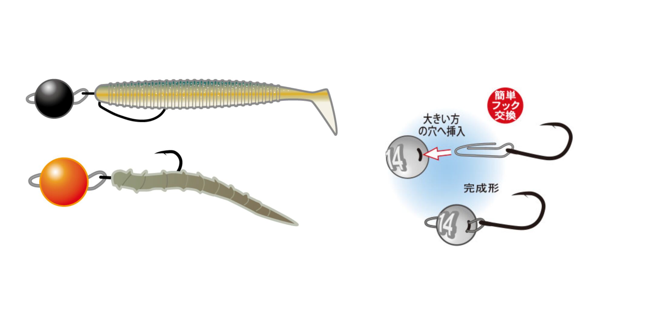 丸いシンカーにスナップを出し入れするだけで、フック、シンカーサイズを交換可能。ヘッドカラーは根魚とチヌに実績のあるブラックと夜光オレンジ。スナップが通るカン付きフックならどんなフックでも使用可能で、イソメやエビ、ワームも自由自在。ブラクリとしても使えます!何魚種釣れるかな!?