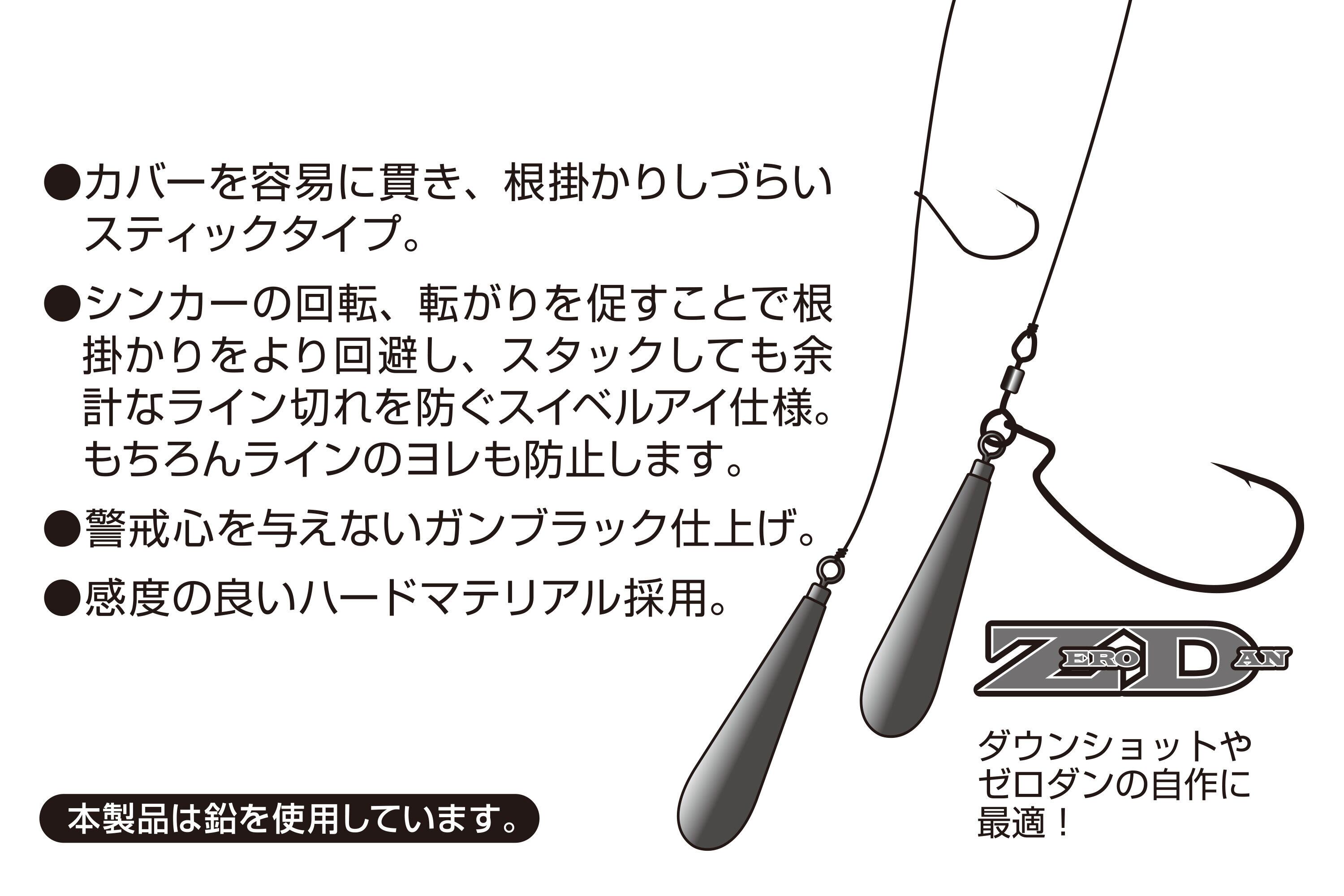 よりウィードレス性を重視したスティック型シンカーです。ダウンショットはもちろん、フリー系リグにも対応し、ストッパーで固定することも可能な絶妙サイズのスイベルアイを採用。また「ゼロダン ワーム217」にも採用しており、「オープンスイベル」との組み合わせでオリジナルのZDシステムも作成可能。