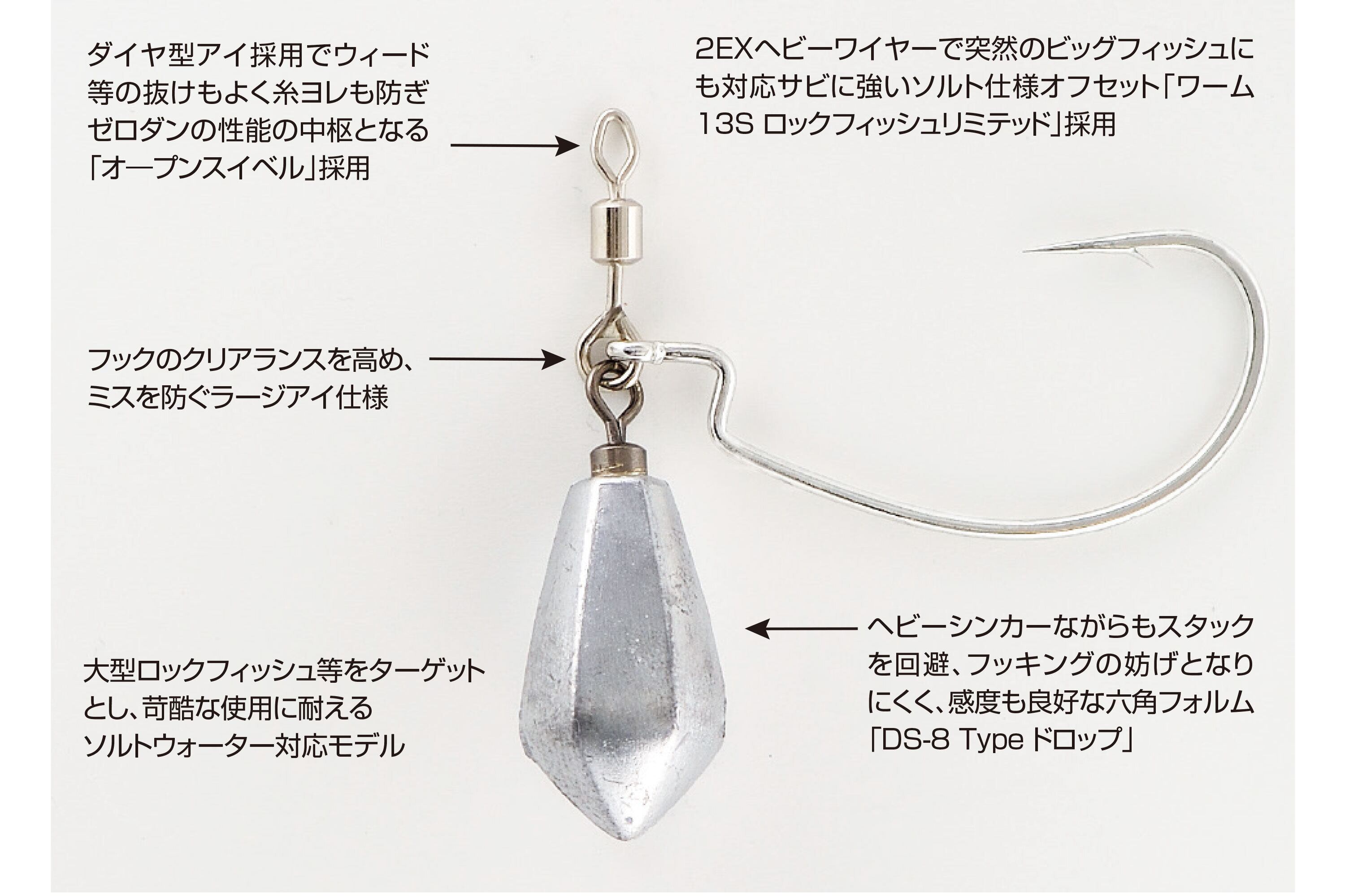 ストラクチャー、ウィードへタイトに落とせ、スナッグレス性に優れ、抜群のキャスタビリティーを備えたZD(ゼロリーダーダウンショット)システム搭載「ゼロダン」のロックフィッシュ対応ソルトチューン仕様。