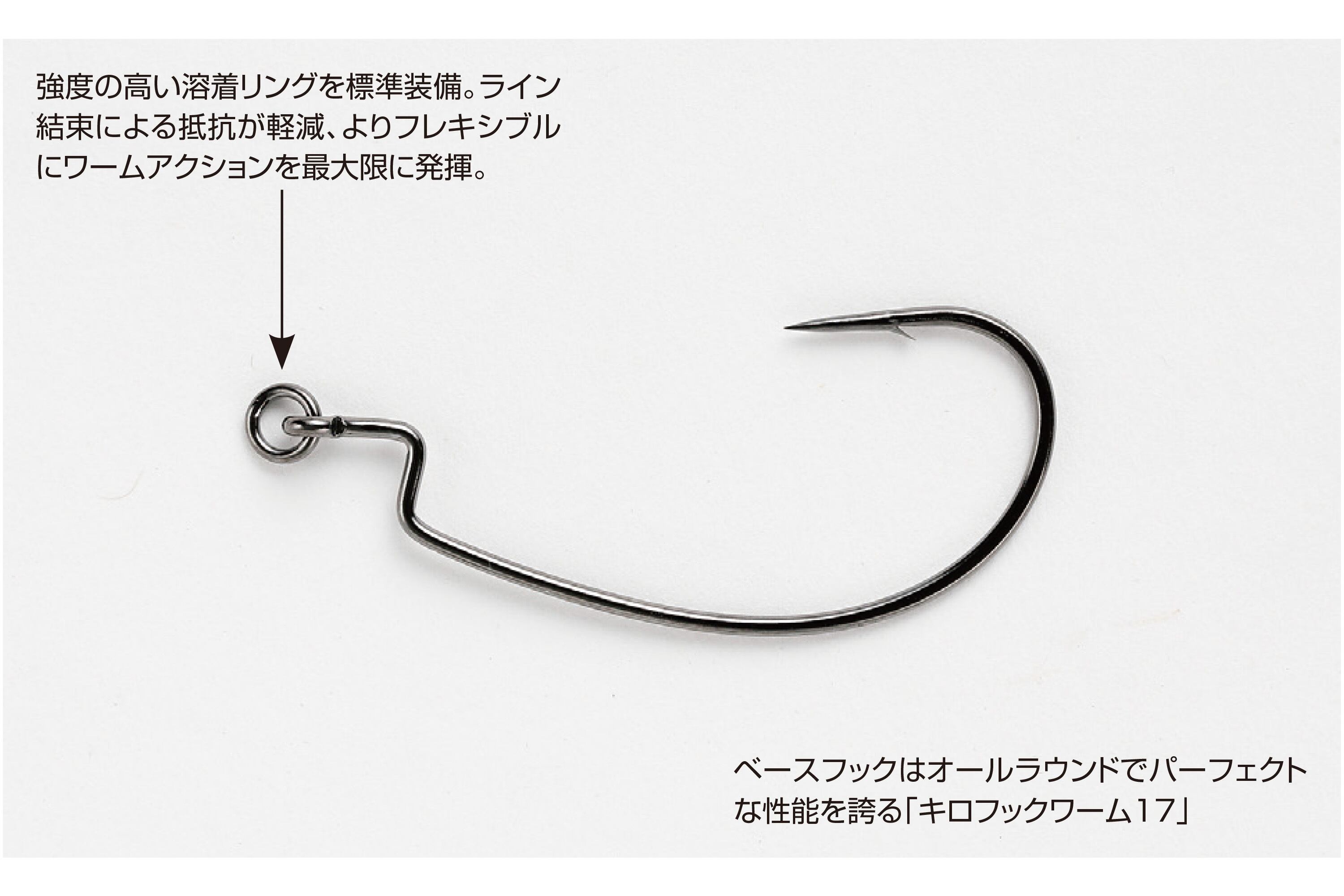 絶対的信頼のオフセットフック「Kgフック」をベースに、高強度なリングを装着。リングにラインを結ぶことでフックの自由度が増し、上下のアクションにこれまでに無いしなやかさをもたらします。クロー系ワームをメインとしたボトムでの倒れ込みアクションや、特にテキダンリグとの相性は抜群!小刻みなシェイクにしっかり追従し、ワームアクションを生かす抜群の組み合わせです。