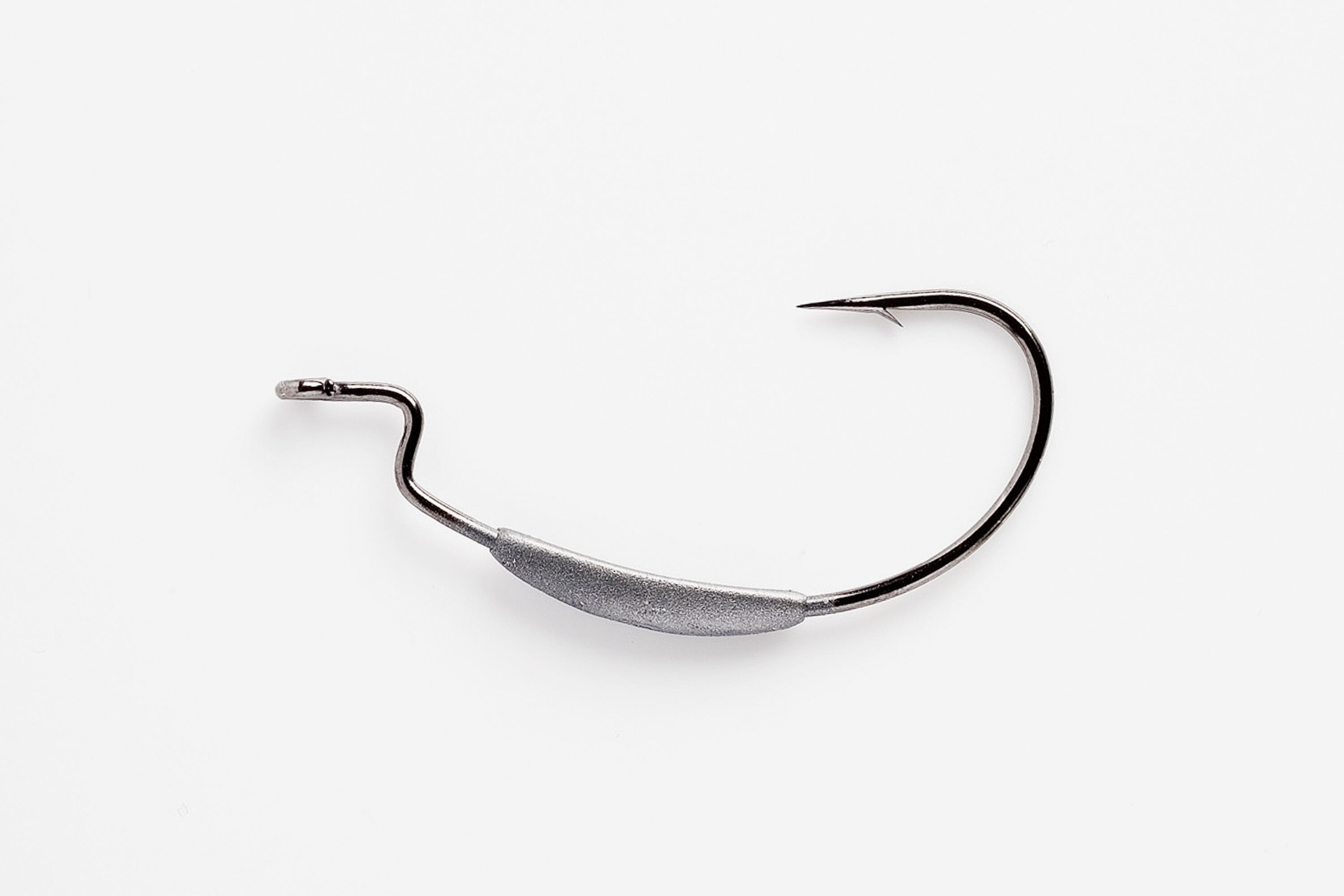 通常テキサスリグでは設定できない重心位置を実現し、さらに低重心なウェイトバランスにより通常のフックでは浮いてきてしまうような、やや早めのリトリーブが可能に。スイミングにおいて重要なファクターである一定速度でのレンジキープも容易となります。シャッド系・スティックベイト系ワームでのストレートリトリーブでロールアクションを発生したり、S字系ワームでの使用ではアクションをサポートし捕食スイッチをON!さらにワームを横倒れさせにくい安定した着底姿勢を見せるため、ホグ系ワームのテキサスリグやヘビーキャロライナリグにおいては、ワームをスタンドアップさせアピールを増大させる等、用途も広いウェイテッドフックです。