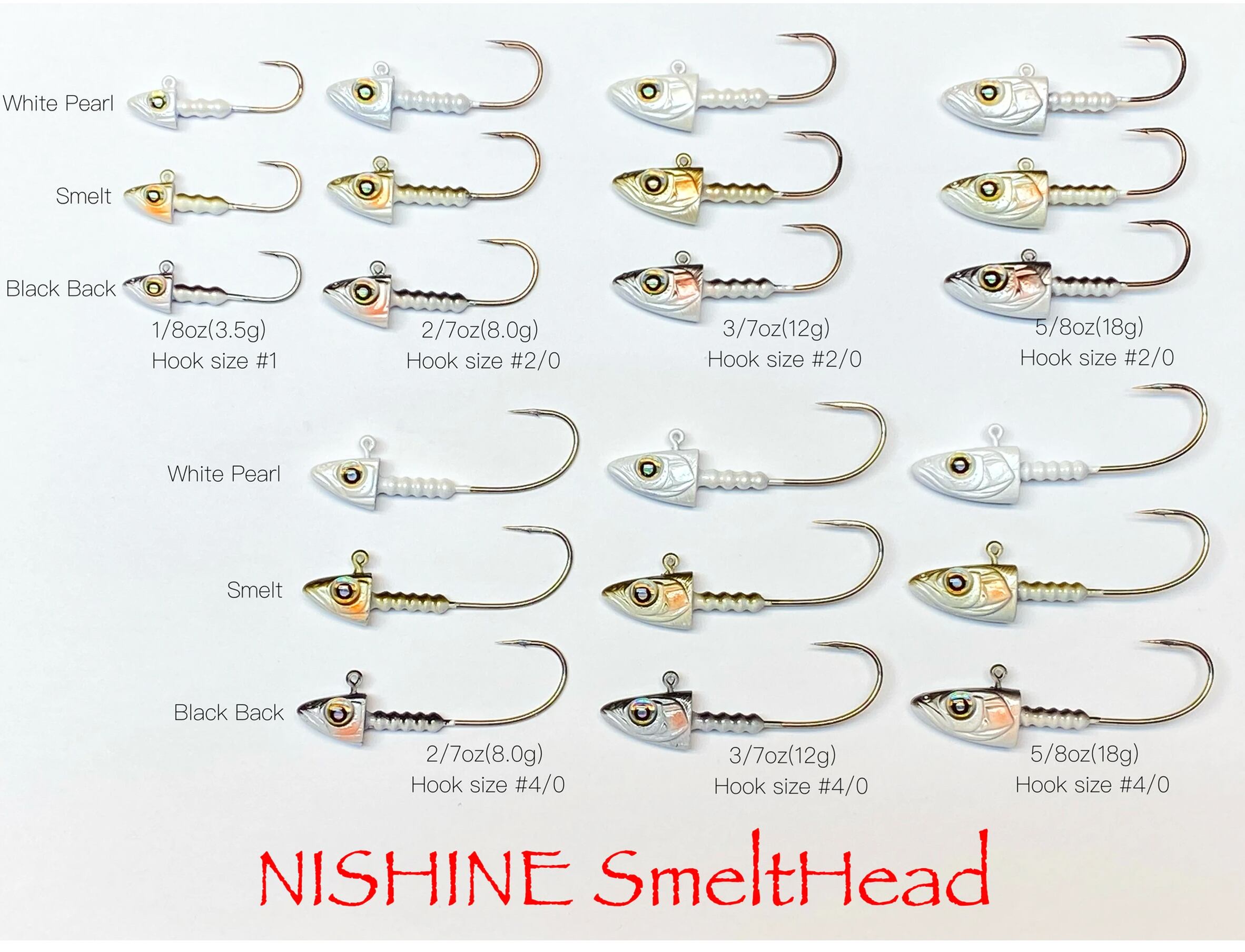 ウエイトサイズにフックサイズ#2/0と#4/0をラインナップしているため(1/8ozを除く)、釣りのシチュエーションや、使用するスイムベイト(ワーム)のサイズに応じて、より細かくマッチングさせることが可能