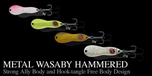 他のルアーでは手の出ないディープな水域や、特に低水温期、魚が口を使わないタフコンディションに活躍するジギングスプーン。田辺哲男が真冬でも通用する数少ないハードルアーとして長年使い続け、その経験の全てをフィードバックし徹底的に釣果にこだわって作りあげたのが「メタルワサビー」です。とにかく”釣れるジグ”として完全にオリジナルで設計。独特なシェイプはスライドアクションとウォブリングフォールを同時に、しかもイレギュラーに繰り出すバランス。合金ボディーはフックが当たるサウンドでの集魚効果を狙っています。デプスファインダーでバスをサーチしながら、ダイレクトアプローチを試みる“シューティング“テクニックでも高い実績を誇ります。この完成度はジギングスプーンエキスパートなら誰もが待ち望んだメタルジグといえるでしょう。