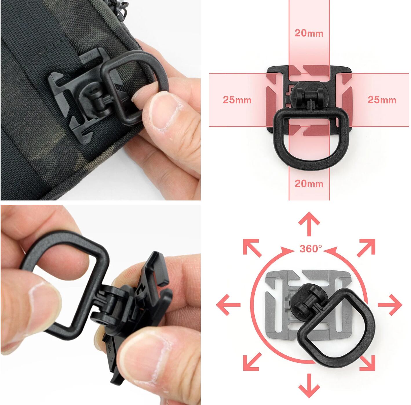 2025Dクリップは、Dカンを付け根ごと45°刻みで360°回転させることができる便利なDカン付きプラパーツです。付ける方向を変えることで20㎜幅と25㎜幅のテープに装着できます。